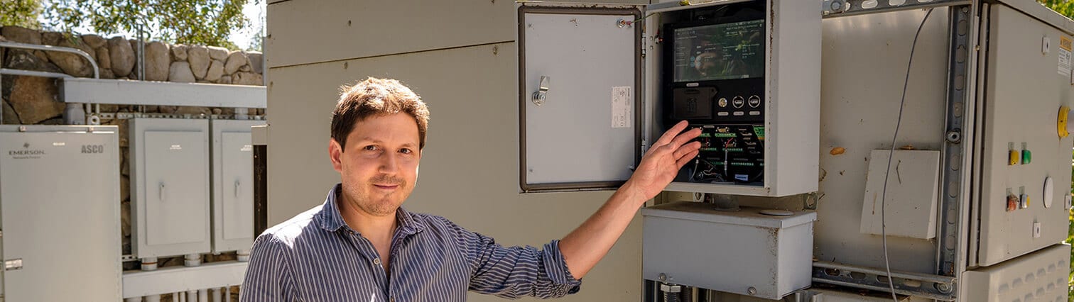 Close by are five stacks of 16 trays each inside white cabinets, the same Tesla lithium ion batteries that power the manufacturer’s cars. This Powerpack, with its 250kW/475kWh rate and capacity, delivers substantial power in a short amount of time through a 250kW Dynapower inverter. When the MicroGrid operates in island mode, the Tesla battery can generate its own 60-Hertz cycles, serving in a master, or grid-forming, role.